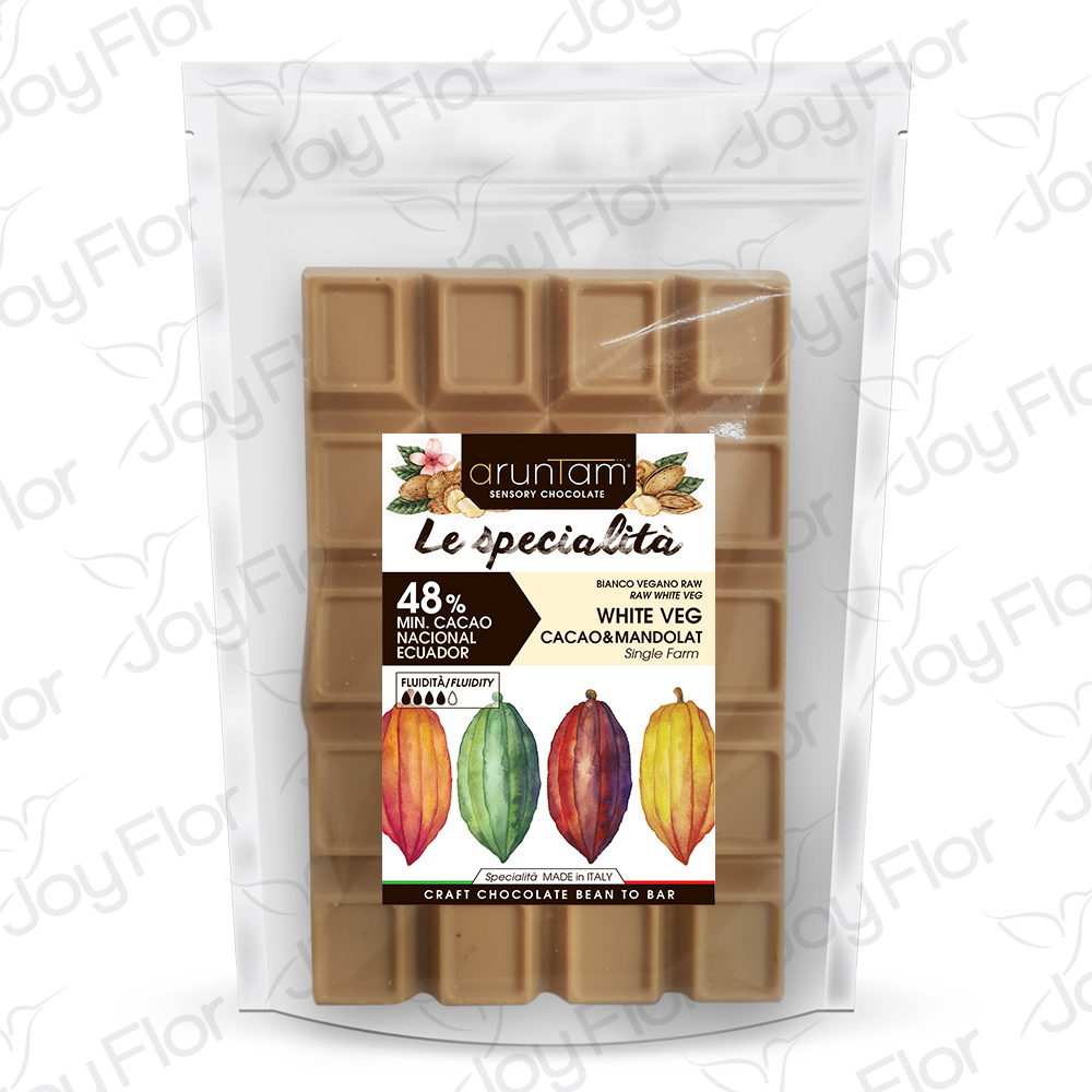 “Le Specialità” (the specialties) collection by Aruntam Sensory Chocolate Made in Italy. Our White Raw Veg bar is the result of the union of Raw Nacional cacao butter of the “Hacienda El Pechichal”, Guayas – Ecuador, which keeps intact the “Complejo Nacional” of Ecuadorian cacao, and of “Mandorla di Toritto”, fruit of the native cultivar “Filippo Cea”, grown, gathered and transformed into an alternative to milk within an uncontaminated and protected environment: the Alta Murgia National Park.